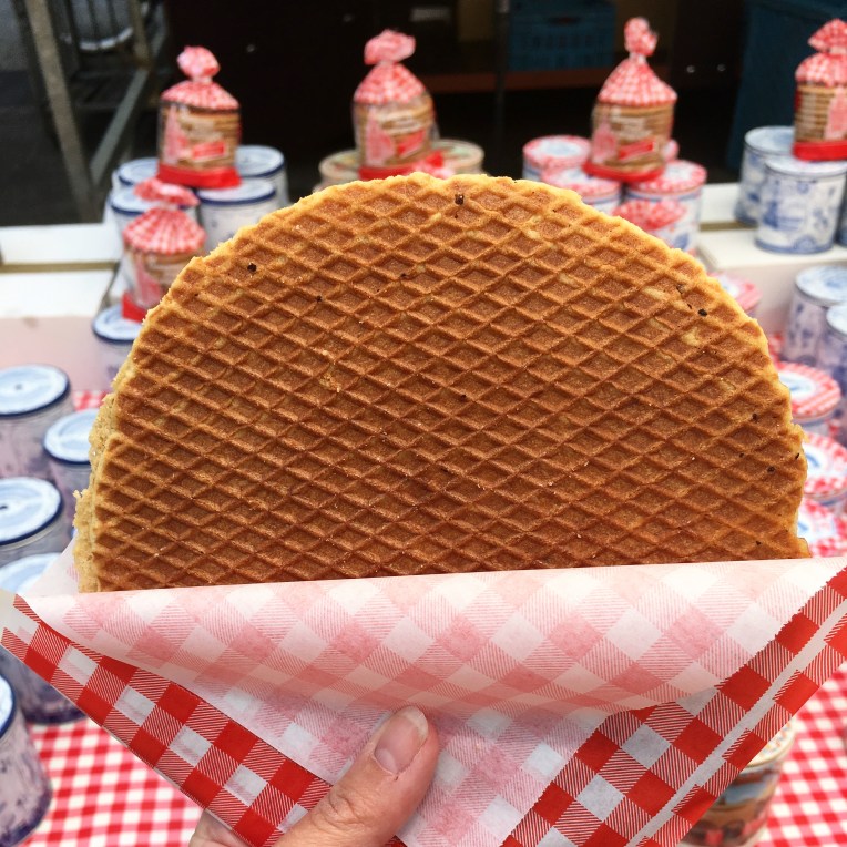 So, a stroopwaffel shouldn’t be a mystery to anyone, as you can buy this all over the place. However, nothing comes close to a freshly made one in Amsterdam. I had never tried one quite like this, and I loved watching them being made. The mixture is pressed into a round waffle iron type machine and once it’s cooked it gets slathered with a caramel or syrup (stroop means syrup) and sandwiched with another freshly made thin, round waffle. The waffles are slightly biscuit like in texture as they snap instead of bend. Normally, you put one of these on top of a hot drink to warm the syrup in the middle, but when you buy one fresh, this is unnecessary! When you get to Albert Cuyp market, have a look for the guy with the red and white checked tablecloth making them straight on the table on front of you. Delicious.