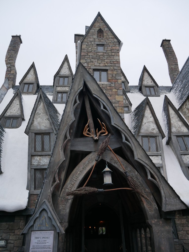 Coming out of the station you are greeted with the gateway and snowy rooftops of Hogsmeade village. It seems to be permanently winter here! Hogsmeade is the only all-wizarding village in Britain and the unusual shapes of the buildings’ roofs and chimneys really help to give that feeling. The buildings are just beautifully constructed with every one being slightly different but still looking perfect together. I love how some of the rooftops are wonky or slanted and all the doorways and frames are made from wood. It’s so traditional.