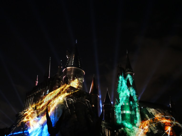 It’s not very long but it is absolutely incredible. The projections are so clear and brightly coloured and the narration to the show is by the Sorting Hat. He goes through all the different house choices before a glittering an explosive finale. This is well worth sticking around for, and despite the times guide saying it was only on at 7.15, it does in fact run every 15 minutes from dusk. It’s definitely worth staying for and I really wouldn’t miss it. To see the castle lit up like that against the night sky is so dramatic and although short, it really packs a punch!