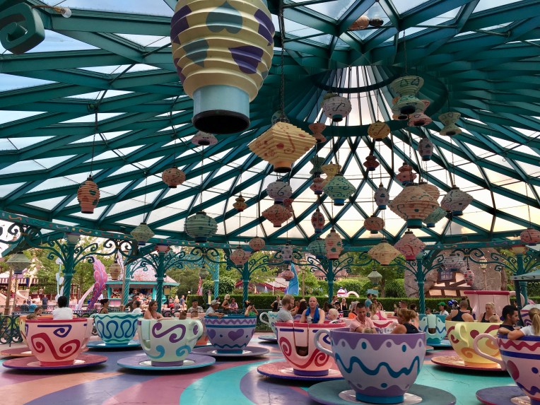 Fantasyland is so brightly coloured and filled with life and I think some of my favourite parts were the ones themed to Alice in Wonderland. Alice’s Curious Labyrinth is a walk through maze filled with familiar faces from the book and film, like the White Rabbit, Cheshire Cat and the Queen herself. If you can find your way and make it up to her castle then you’ll be treated to some amazing views of the park. Just outside the maze is an area set up for the Mad Hatter’s Tea Party and not far off are his teacups for you to ride!